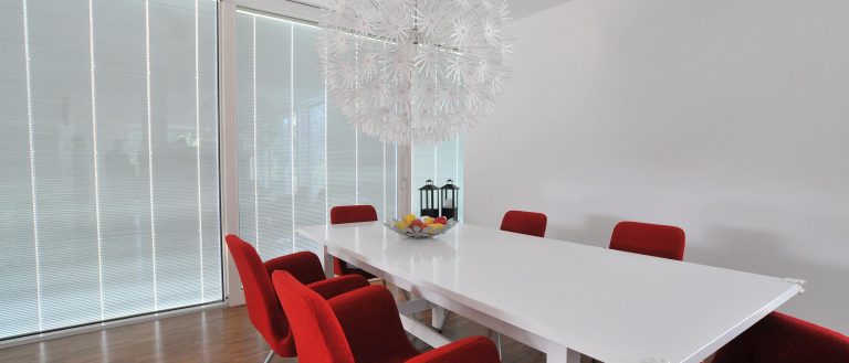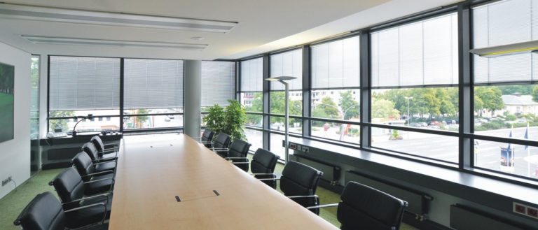 Die Stellung der schmalen Lamellen ist veränderbar und kann somit Beleuchtungsunterschiede in Innenräumen verringern oder intensivieren: angenehmes, diffuses Umgebungslicht oder 100% Tageslicht – innovativer Sonnenschutz steigert das Wohlbefinden und die Lebensqualität.